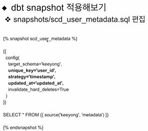 - dbt에서는 테이블의 변화를 계속적으로 기록함으로써 과거 어느 시점이건 다시 돌아가서 테이블의 내용을 볼 수 있는 기능이다.