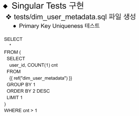 - 커스텀 테스트(Singular) --test 폴더: 기본적으로 SELECT로 간단하며 결과가 리턴되면 "실패"로 간주한다.